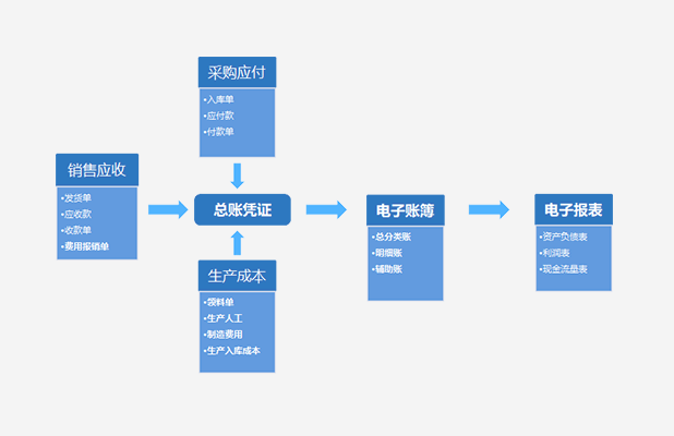 自動(dòng)從供應(yīng)鏈、應(yīng)收應(yīng)付、生產(chǎn)制造等模塊收集各類原始數(shù)據(jù),生成記賬憑證,賬簿與會(huì)計(jì)報(bào)表。