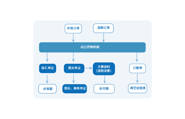 自動(dòng)根據(jù)外貿(mào)訂單生成進(jìn)出口報(bào)關(guān)、報(bào)檢、結(jié)匯單證, 按照外貿(mào)條款要求安排??者\(yùn)訂艙發(fā)運(yùn), 根據(jù)外貿(mào)訂單與采購單之間的關(guān)聯(lián)關(guān)系, 生成開票資料讓供應(yīng)商按報(bào)關(guān)要求開增值稅發(fā)票, 降低制單的工作量,提高報(bào)關(guān)和退稅效率。